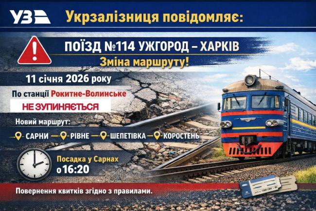 Як зазначається, за інформацією "Укрзалізниці" через пошкодження верхньої будови колії, 11 січня 2026 року пасажирський потяг №114 сполученням Ужгород – Харків не здійснюватиме проходження по станції Рокитне-Волинське.