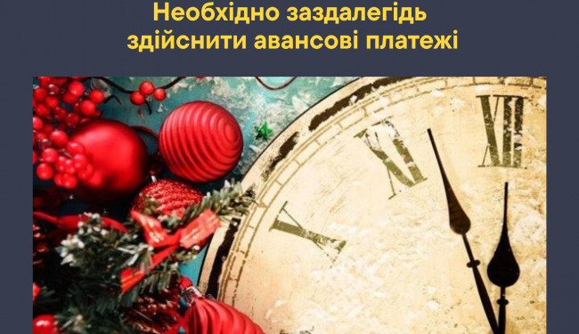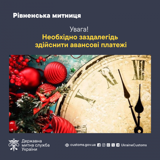 Рівненська митниця повідомляє, що для безперебійного здійснення митного оформлення у період з 30.12.2025 року по 01.01.2026 року платникам податків рекомендується заздалегідь здійснити авансові платежі на депозитні рахунки, відкриті в Казначействі для Держмитслужби та її територіальних органів.