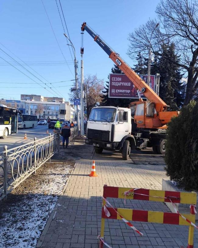 Фахівці КП«Рівнеелектроавтотранс», а саме працівниками служби електрогосподарства встановили 2 нових металевих опори замість аварійних по вулиці Соборній напроти майдану Незалежності.