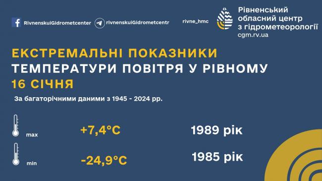 Екстремальні показники температури повітря у Рівному за 16 січня: максимальна температура повітря була +7.4° у 1989 році, а мінімальна -24,9° у 1985 році. • Рівненський обласний центр з гідрометеорології