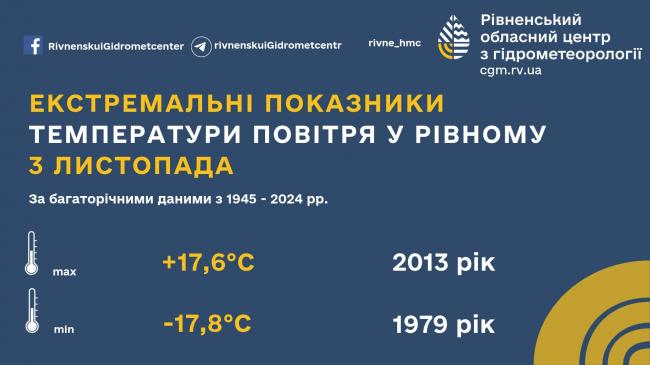 Максимальна температура повітря була +17,6° у 2013 році, Мінімальна -17,8° у 1979 році. -- Рівненський обласний центр з гідрометеорології