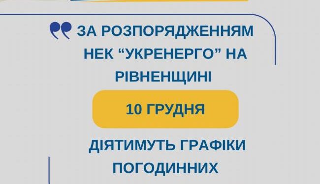Увага! У зв’язку зі складною ситуацією в енергосистемі держави за командою НЕК «Укренерго» на Рівненщині 10.12.2025 застосовуватимуться графіки погодинних відключень для побутових споживачів.