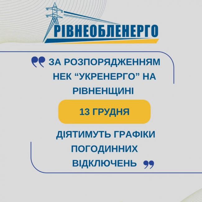 Увага! У зв’язку зі складною ситуацією в енергосистемі держави за командою НЕК «Укренерго» на Рівненщині 13.12.2025 застосовуватимуться графіки погодинних відключень для побутових споживачів.