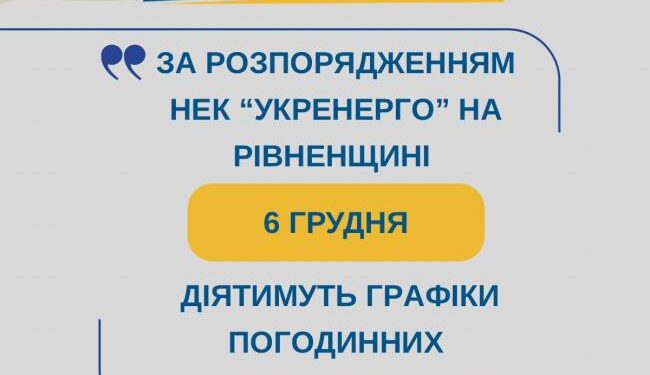 Увага! У зв’язку зі складною ситуацією в енергосистемі держави за командою НЕК «Укренерго» на Рівненщині 06.12.2025 застосовуватимуться графіки погодинних відключень для побутових споживачів.