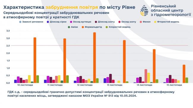 За результатами досліджень Комплексної лабораторії спостережень за станом забруднення навколишнього природного середовища Рівненського ЦГМ у період 10 – 15 листопада 2025 року середньодобові концентрації забруднювальних речовин в атмосферному повітрі м.Рівного перевищували ГДКс.д. за наступними домішками: