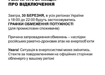30 березня в усіх регіонах України застосовуватимуть графіки обмеження потужності для промислових споживачів з 18:00 до 22:00. Фото: Укренерго В "Укренерго" пояснили,...
