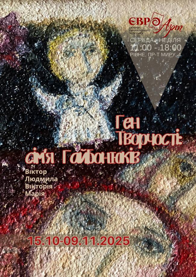У малих залах галереї європейського живопису «Євро-Арт» 15 жовтня 2025 року о 18:00 відбудеться презентація виставки «Ген Творчості: сім’я Гайбонюків». Рівне, пр. Миру, 4.