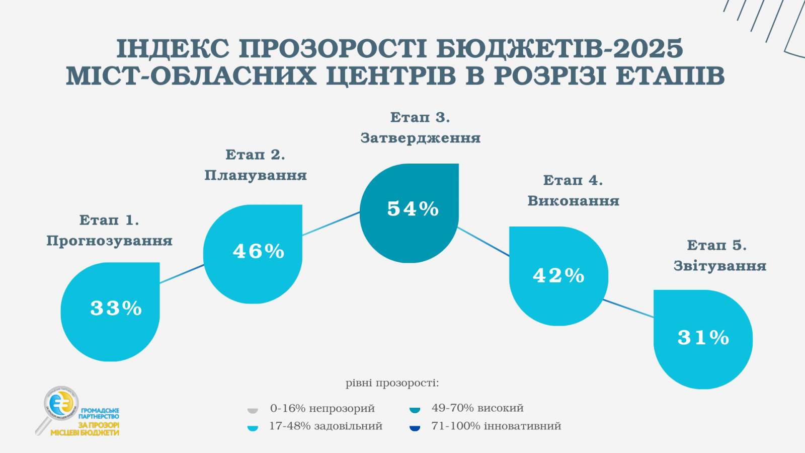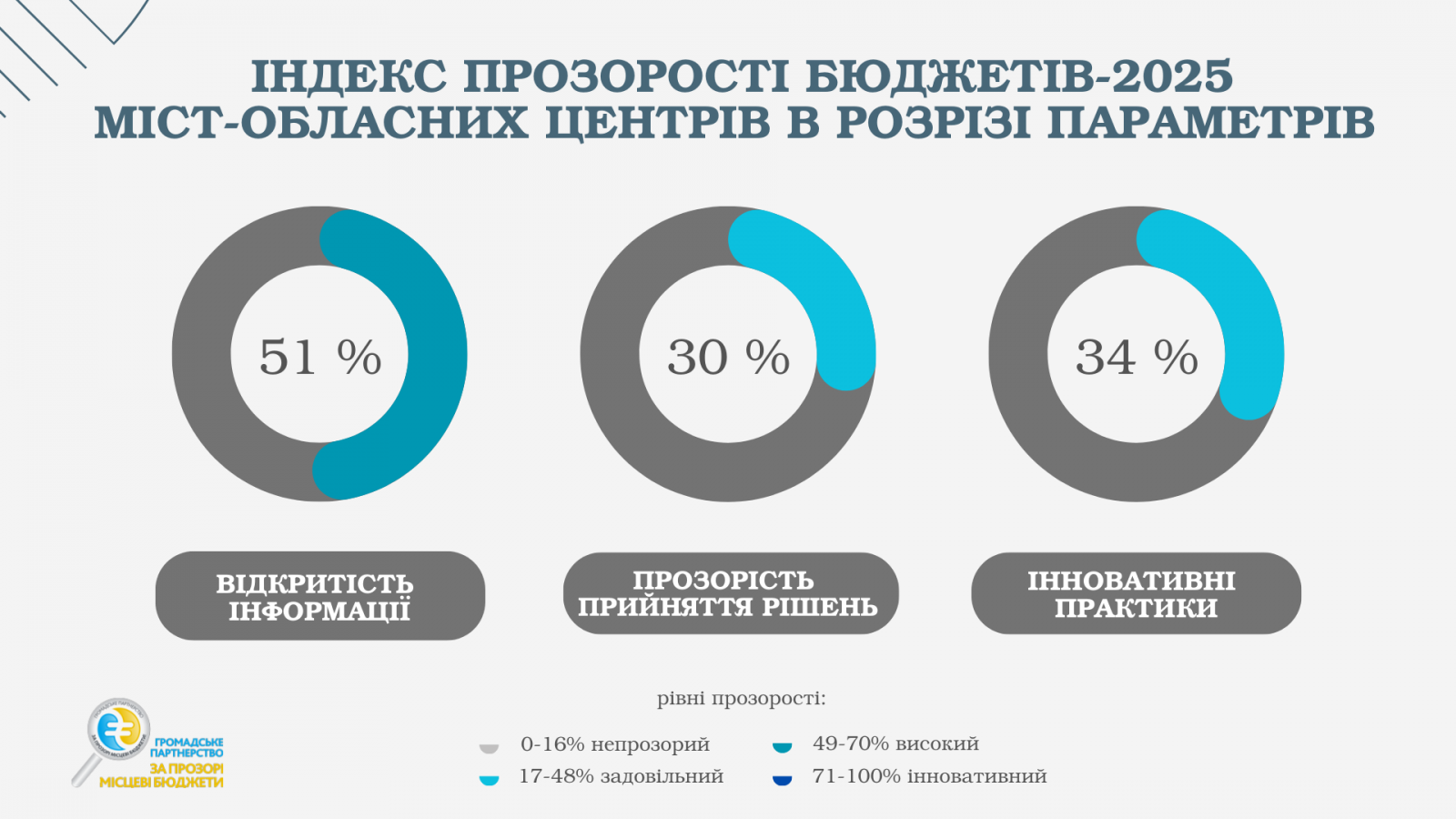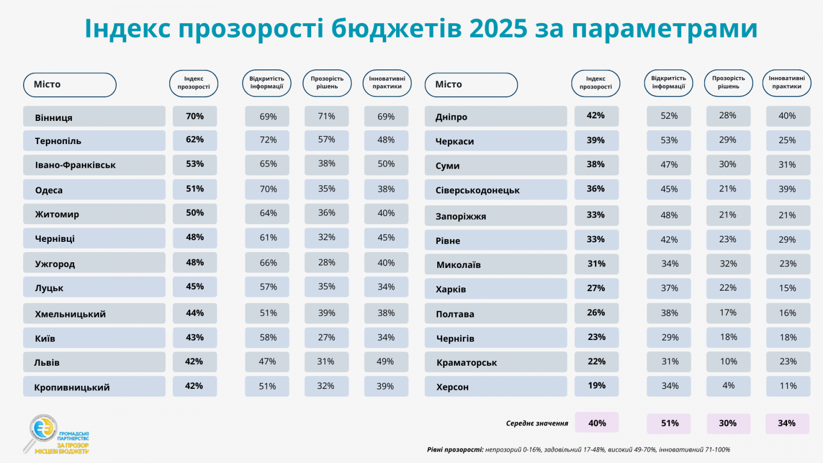 Середній індекс прозорості бюджетів у містах-обласних центрах за підсумками 2025 року складає 40% та відповідає задовільному рівню. Про це свідчить Індекс прозорості бюджетів, підготовлений Громадським Партнерством “За прозорі місцеві бюджети!”.
