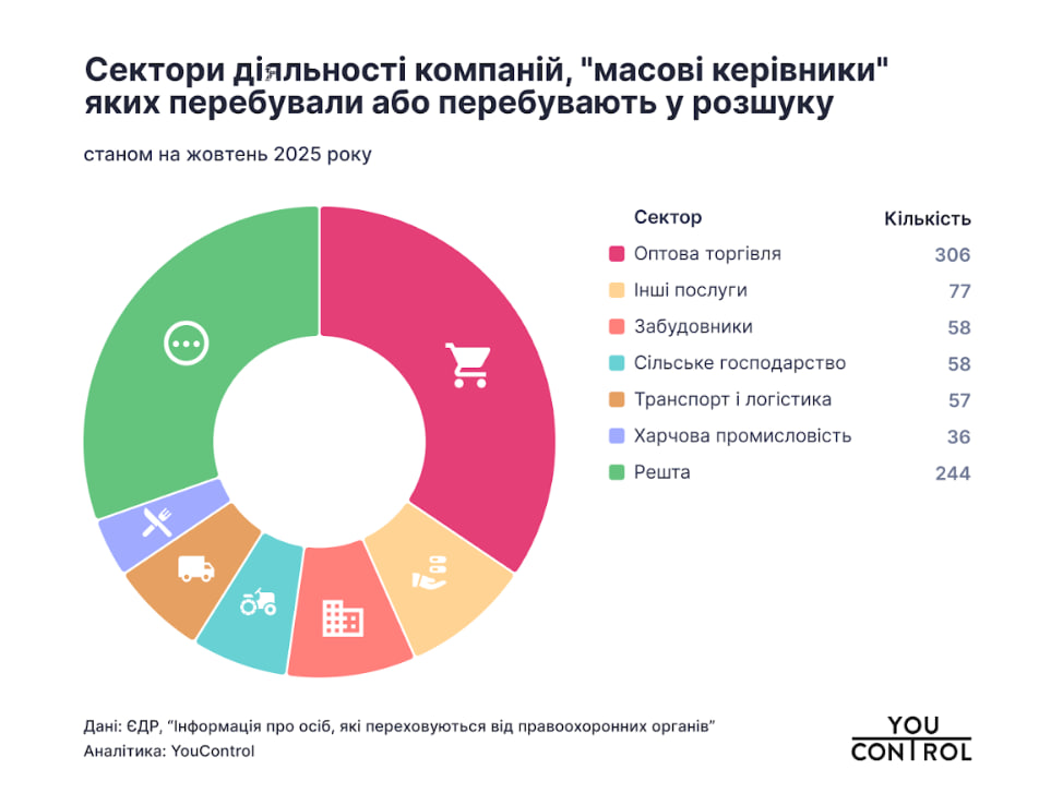 Практично третина, а саме 35% юросіб, які очолюють “масові керівники” у розшуку, працює у сфері оптової торгівлі (306 підприємств). На сектор “Інші послуги” припадає 9% (77 компаній). А на забудовників — 8,6% (73 компанії). Сільське господарство разом з транспортом і логістикою розділили по 7% із 58 та 57 компаніями відповідно. Харчова промисловість — 4% (36), операції з нерухомістю — 3% (25) та роздрібна торгівля — 3% (22).