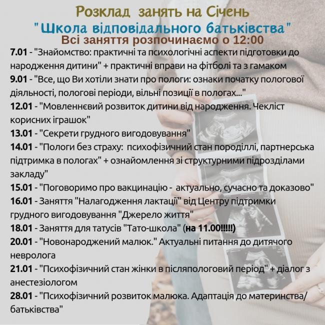 - 28 січня — «Психофізичний розвиток малюка. Адаптація до материнства та батьківства».