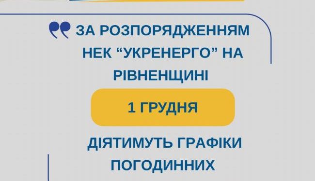 Увага! У зв’язку зі складною ситуацією в енергосистемі держави за командою НЕК «Укренерго» на Рівненщині 01.12.2025 застосовуватимуться графіки погодинних відключень для побутових споживачів.