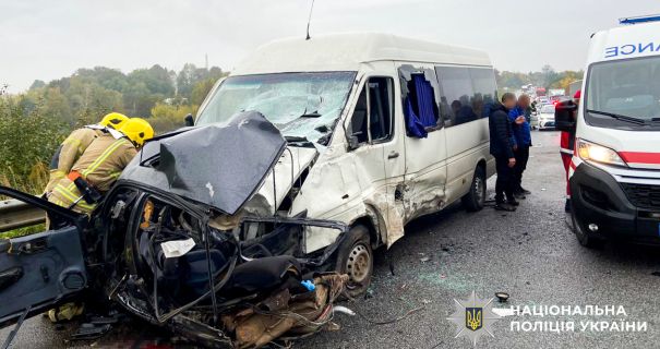 На трасі зіткнулися маршрутка Volkswagen та автомобіль Opel. Внаслідок зіткнення одна людина загинула, ще четверо дістали травми – їх госпіталізували. Від удару легковик перетворився на купу металу.