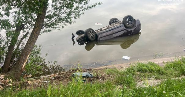 33-річна водійка Hyundai Santa Fe не впоралася з керуванням на повороті, збила дорожній знак, після чого авто перекинулося й опинилося в озері.