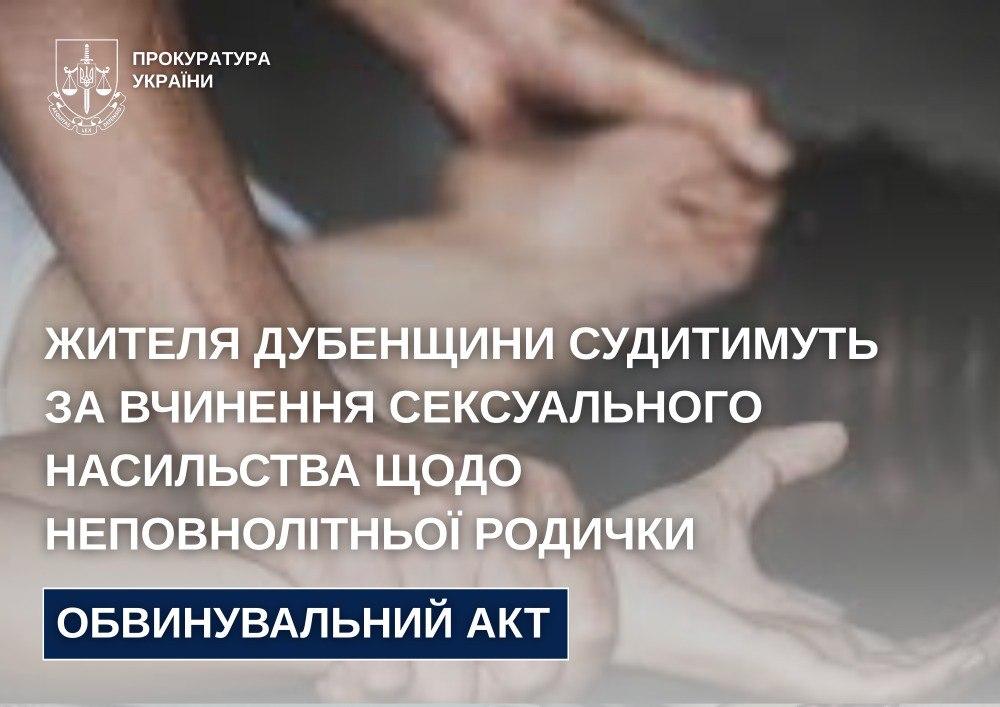 Прокурори Дубенської окружної прокуратури скерували до суду обвинувальний акт, стосовно 25-річного чоловіка, якому інкримінують вчинення сексуального злочину щодо неповнолітньої двоюрідної сестри.