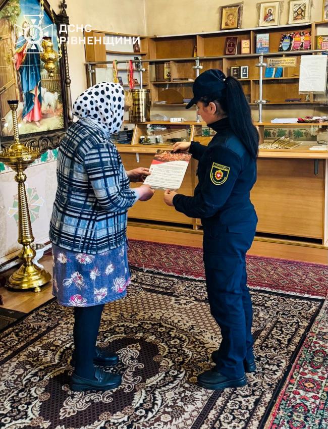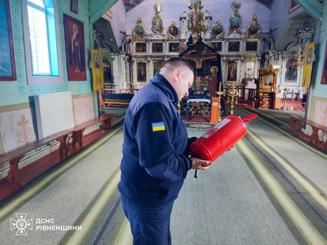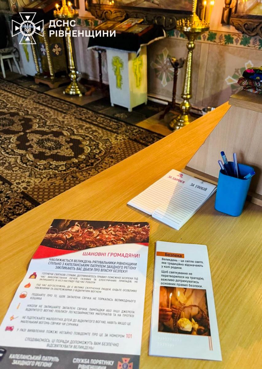 Офіцери-рятувальники громад Дубенського та Вараського районів напередодні Великодня проводять профілактичні відпрацювання культових споруд. Перевіряють стан евакуаційних виходів і наявність первинних засобів пожежогасіння, а також нагадують священнослужителям правила пожежної безпеки під час богослужінь.