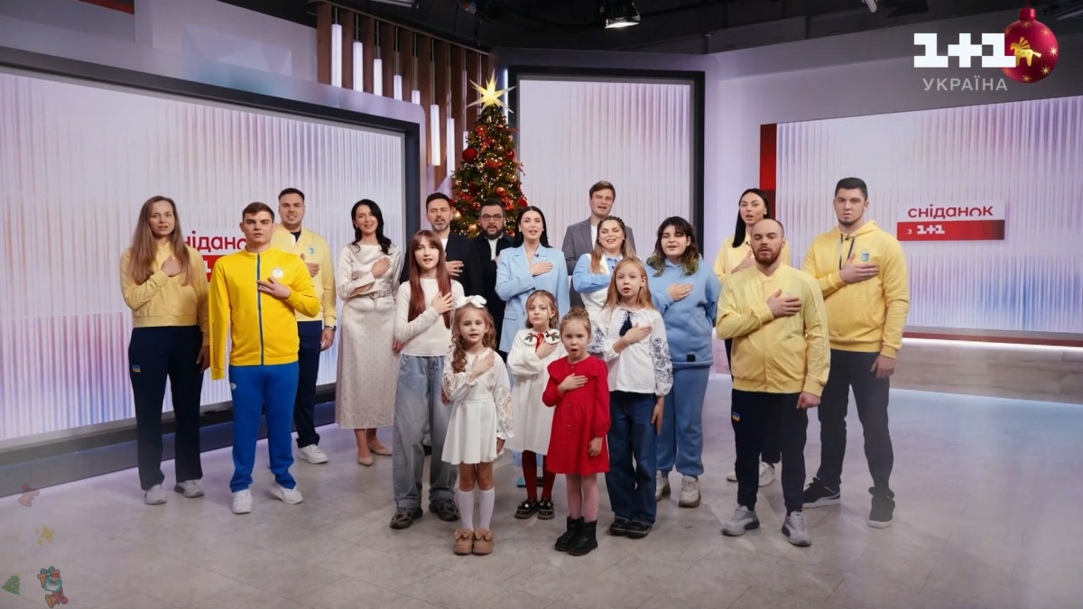 «1+1 Україна» показував «Новорічний Вечірній квартал», а після привітання президента на каналі ввімкнули гімн у виконанні ведучих, журналістів та учасників різних шоу телеканалу, зокрема «Вечірній квартал», «Танці з зірками», ТСН, «Сніданок з 1+1». Разом з журналістами славень заспівали діти, спортсмени та військовослужбовці.