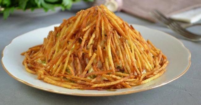 Щільно викладіть отриману масу у глибоку піалу, накрийте пласкою тарілкою та обережно переверніть. Змастіть поверхню залишками майонезу та щедро вкрийте салат хрусткою картопляною соломкою, надаючи страві форми стогу.