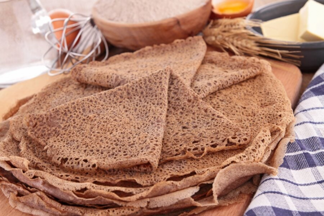 - Добре розігрійте сковорідку, змастіть її вершковим маслом. Вилийте половину черпака тіста, рівномірно розподіліть. Смажте з одного боку до рум’яних країв, переверніть і потримайте ще кілька секунд.