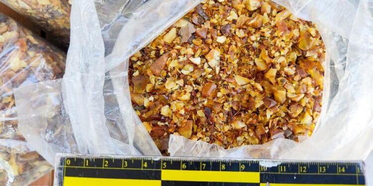 Так, учора, 11 березня, у селі Колоденка поблизу магазину оперативники побачили жінку, яка підозріло себе поводила. Під час поверхневої перевірки у 57-річної місцевої жительки поліцейські виявили та вилучили майже 5 кілограмів «сонячного» каміння.