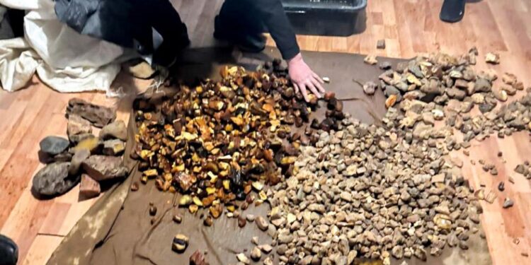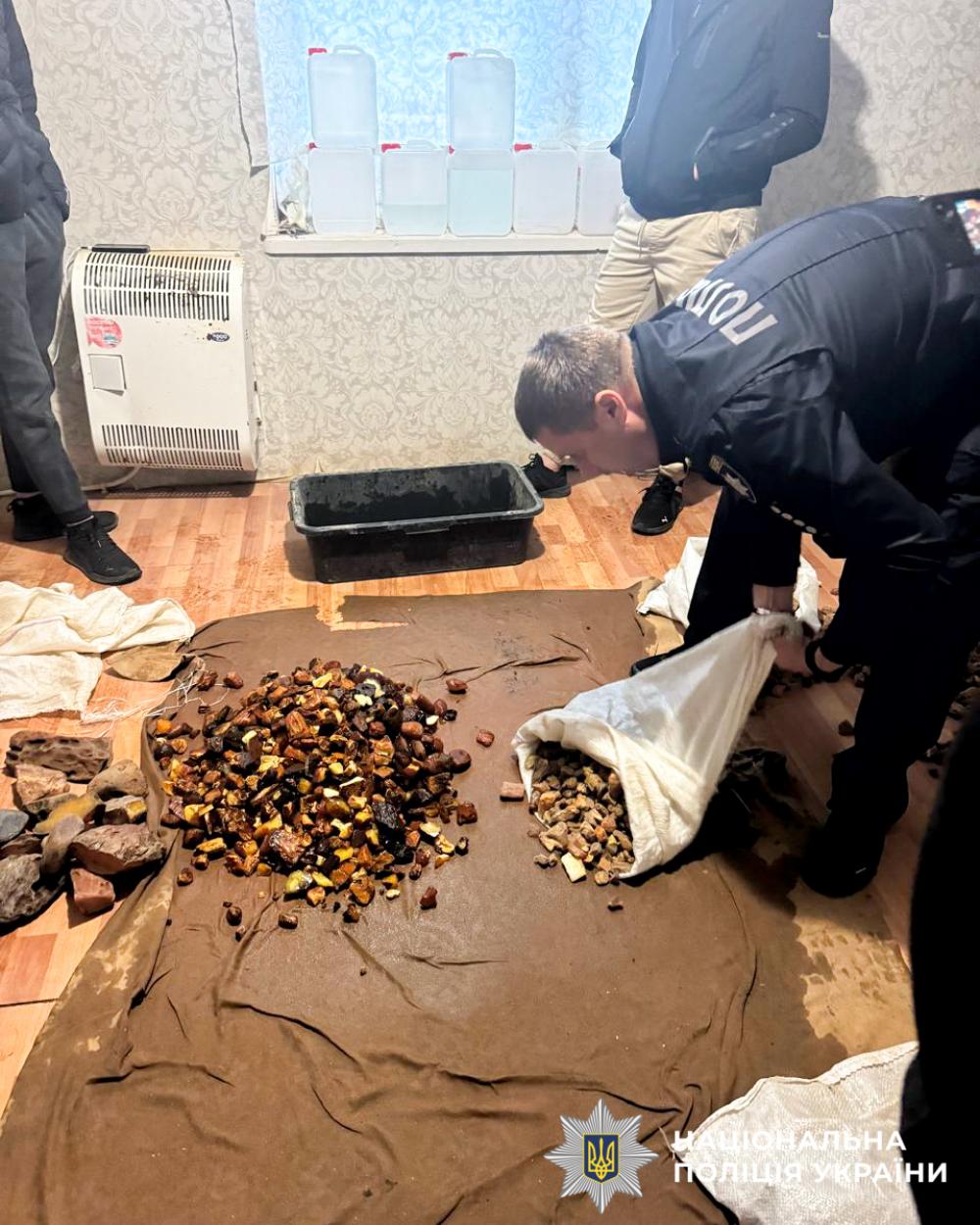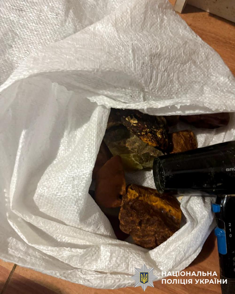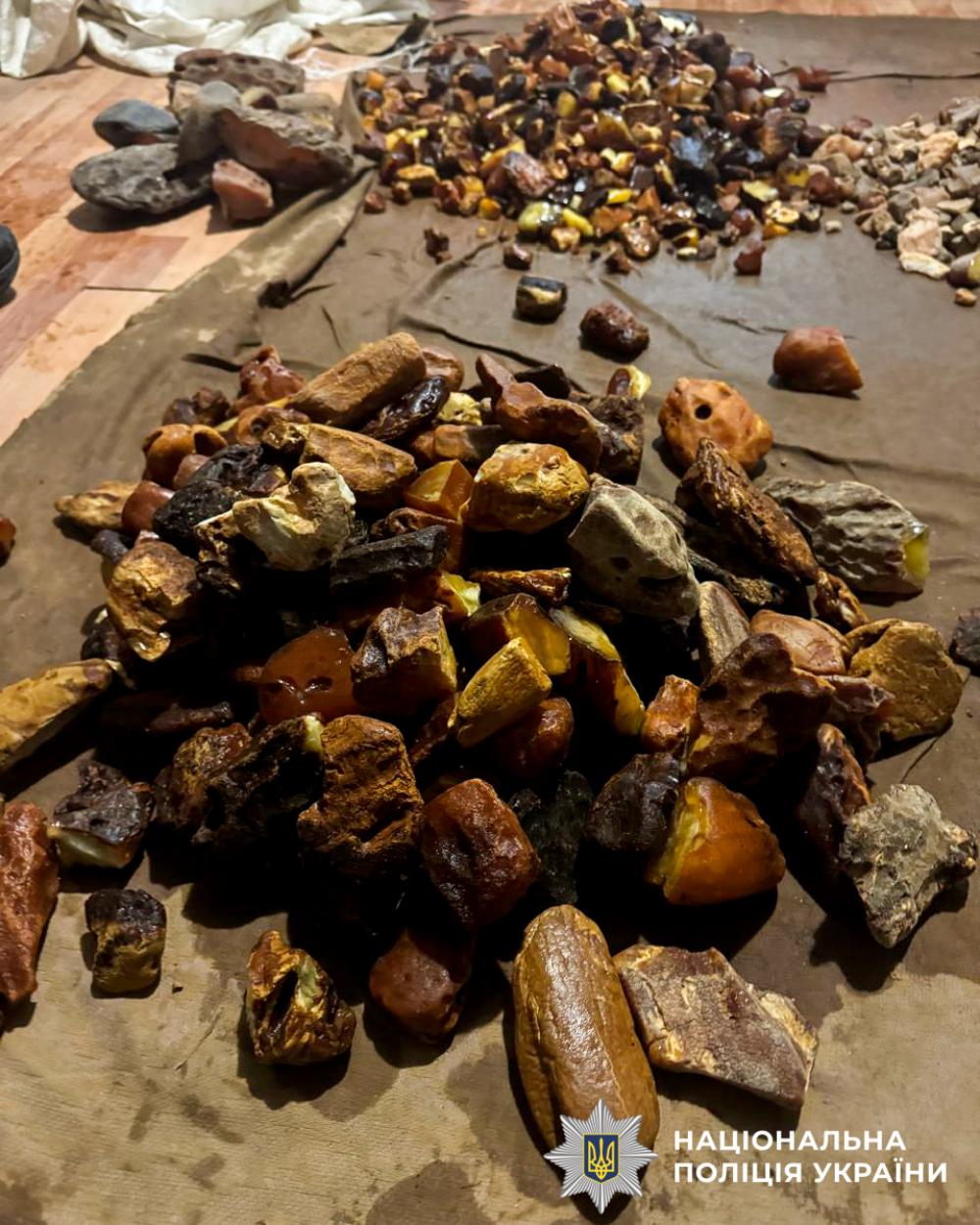 У межах відкритого кримінального провадження за ч.2 ст.240-1 КК України (незаконне видобування, збут, придбання, передача, пересилання, перевезення, переробка бурштину) поліцейські провели обшуки під час яких вилучили понад 80 кілограмів «сонячного» каміння, знаряддя для його обробки, електронні ваги, мобільні телефони та автівку.