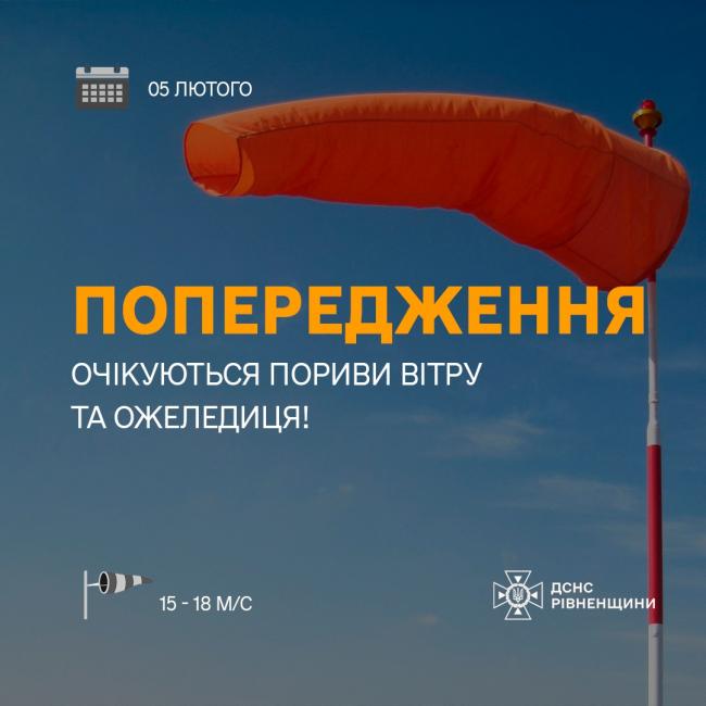 За інформацією Рівненського обласного центру з гідрометеорології, вдень 5 лютого по Рівненській області та м. Рівному на дорогах ожеледиця, пориви південно-східного вітру 15-18 м/с.