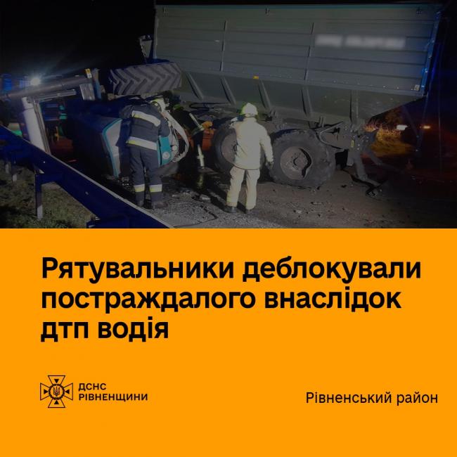 Співробітники ДСНС оперативно прибули на місце події, деблокували водія трактора за допомогою гідравлічних інструментів та передали його працівникам швидкої. Крім того, вони відключили клеми акумуляторних батарей у транспортних засобах, аби запобігти виникненню пожежі.