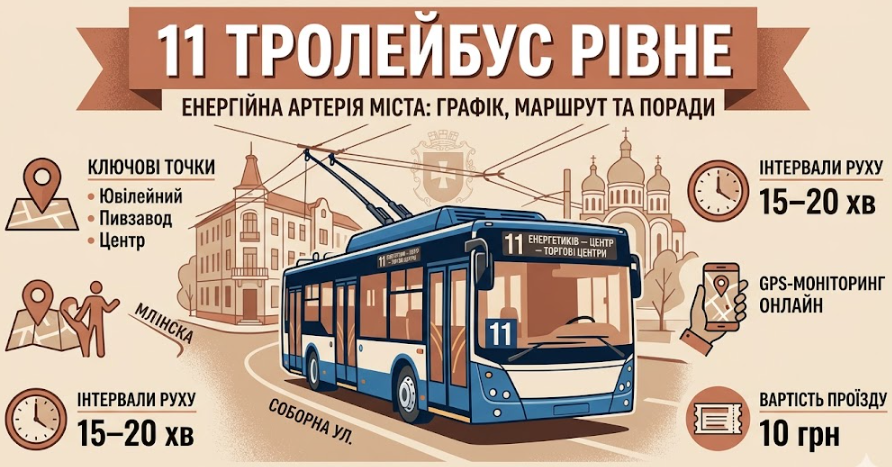 Тролейбус №11 у Рівному – це ключовий маршрут для тих, кому потрібно швидко дістатися з великих торгових зон (район “Екватора” та Ювілейного) до центральної частини міста та енергетичного вузла на вулиці Млинівській. Це динамічний маршрут, який часто обирають для ділових поїздок та шопінгу.