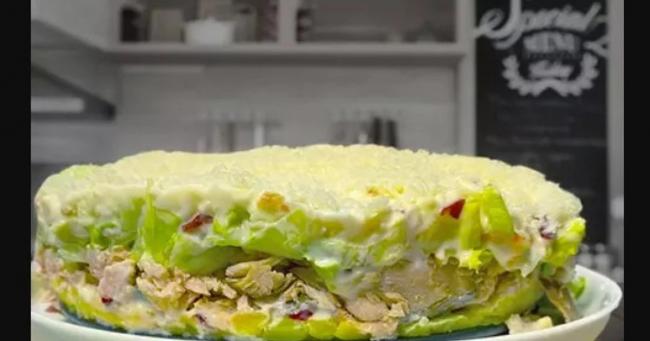 Перед подаванням на стіл готову страву рекомендується витримати в холодильнику протягом години. Це дозволить шарам краще поєднатися, а салату добре тримати форму під час нарізання.