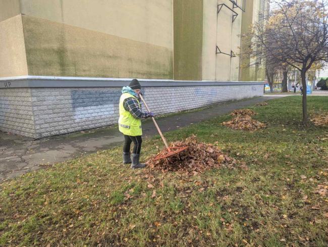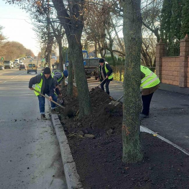 Працівники Тресту зеленого господарства працюють на вулиці Поповича. Туди було завезено грунт та розкидано під деревами.