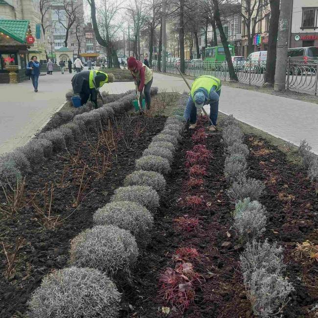 Там вони проводили обрізку дерев. Інші працівники комунального підприємства займалися доглядом за квітами-багаторічниками та прополюванням клумб по місту.
