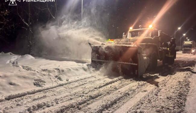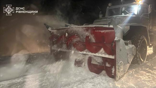 На автодорозі державного значення М-06 «Київ – Чоп» у межах Рівненського району наразі працює спеціалізована інженерна машина ДСНС Рівненщини – шнекороторний снігоочищувач.