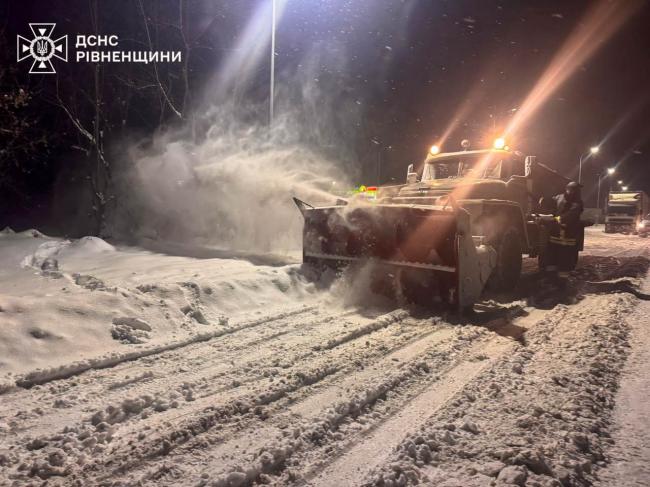 На автодорозі державного значення М-06 «Київ – Чоп» у межах Рівненського району наразі працює спеціалізована інженерна машина ДСНС Рівненщини – шнекороторний снігоочищувач.