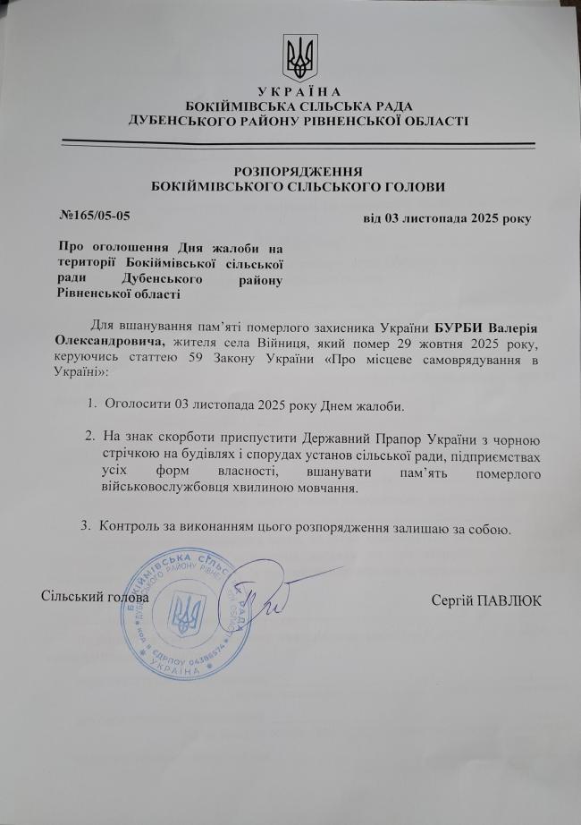 У документі зазначають, на території Бокіймівської сільради для вшанування пам'яті померлого захисника України Бурби Валерія Олександровича, жителя села Війниця, який помер 29 жовтня 2025 року, керуючись статтею 59 Закону України "Про місцеве самоврядування в Україні" оголосити 3 листопада 2025 року Днем жалоби.