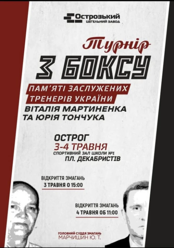 В Острозі проведуть Турнір із боксу пам'яті заслужених тренерів України Віталія Мартиненка та Юрія Тончука.