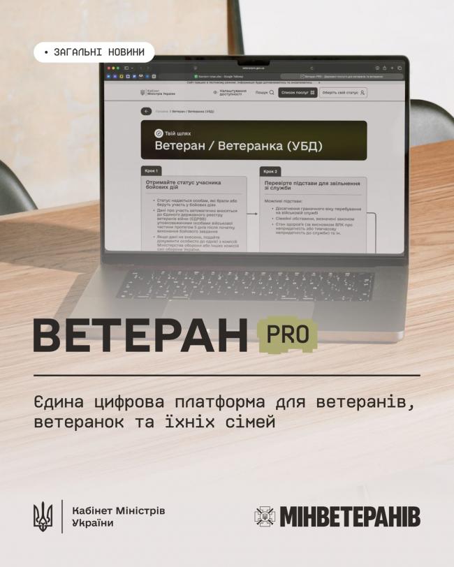 Уряд України на виконання доручення Президента України представив Ветеран PRO — державну цифрову платформу для ветеранів, ветеранок і їхніх родин, де зібрано всю інформацію про пільги, програми, послуги та можливості в одному місці. Проєкт реалізовано Міністерством у справах ветеранів України.