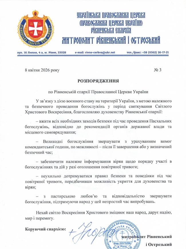Як зазначається, документ має на меті забезпечити належне та безпечне проведення богослужінь у період святкування Світлого Христового Воскресіння, враховуючи сучасні виклики та загрози, пов’язані з війною.
