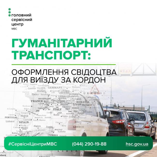 Свідоцтво про реєстрацію для поїздок за кордон таких транспортних засобів видається за умови подання до сервісного центру МВС сертифікату відповідності транспортного засобу та підтвердження митними органами інформації про оформлення декларації про перелік товарів, що визнаються гуманітарною допомогою. Відомості про оформлення декларації про перелік товарів, що визнаються гуманітарною допомогою, перевіряються шляхом надсилання сервісними центрами МВС запиту до митних органів.