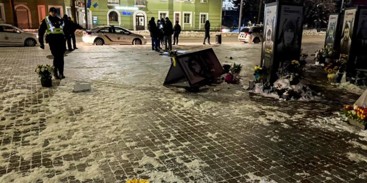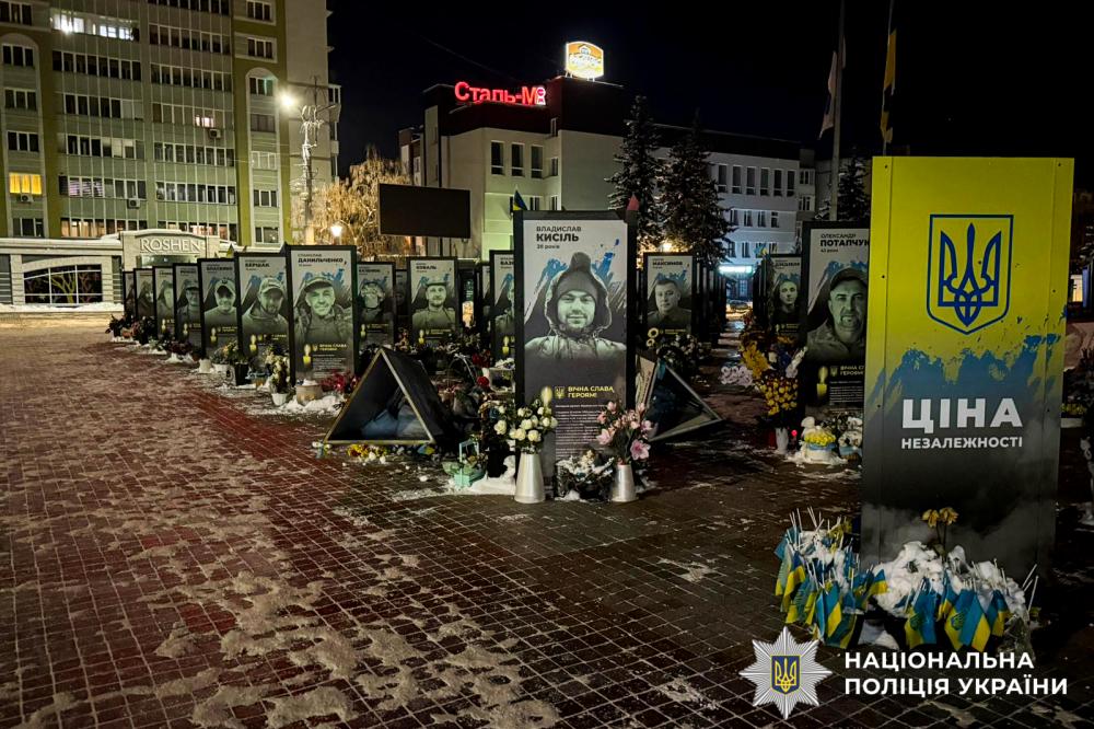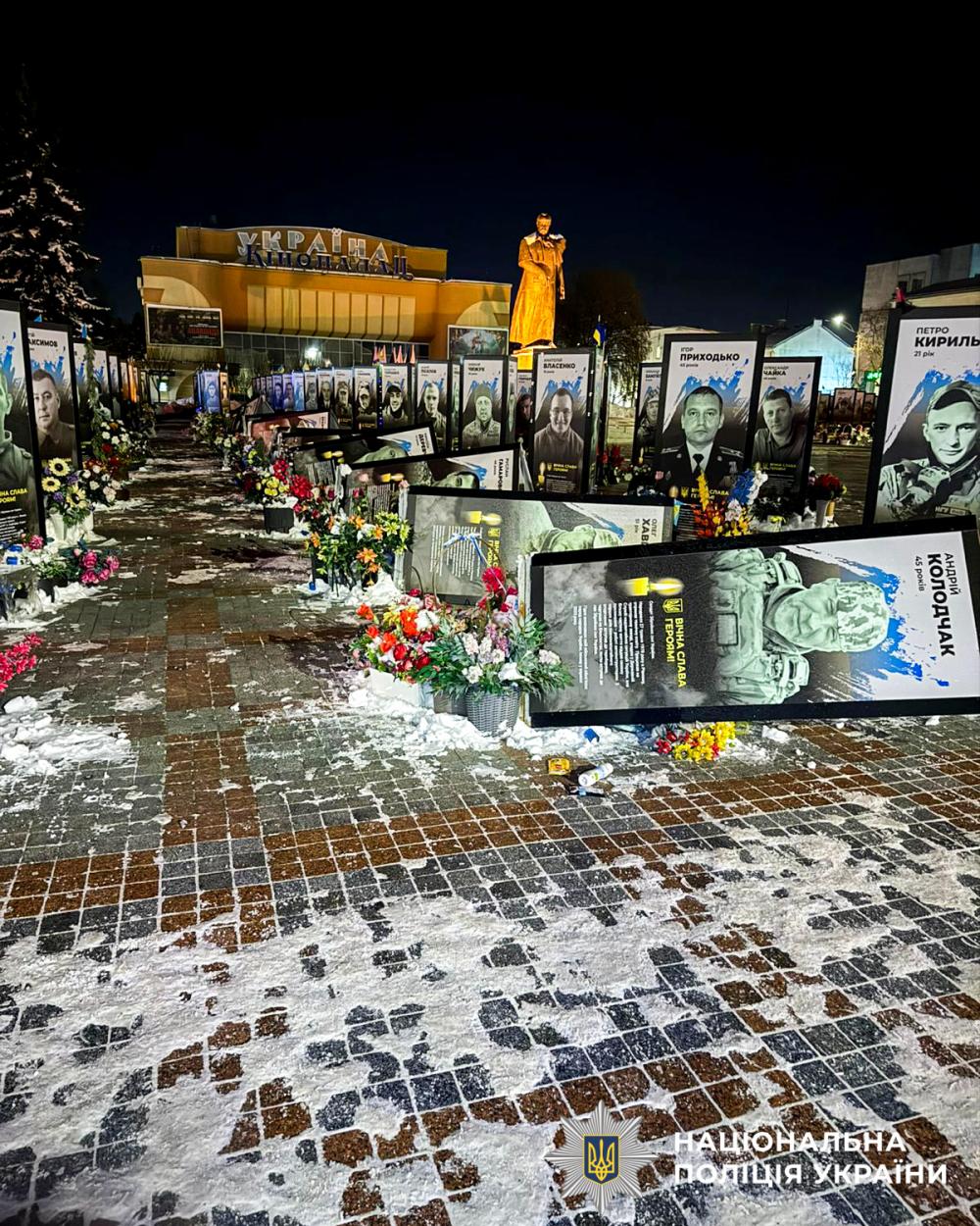 До поліції 16 січня близько 23 години надійшло повідомлення, що на Майдані Незалежності невідома жінка поводиться неадекватно та перекидає портрети полеглих у війні Захисників.