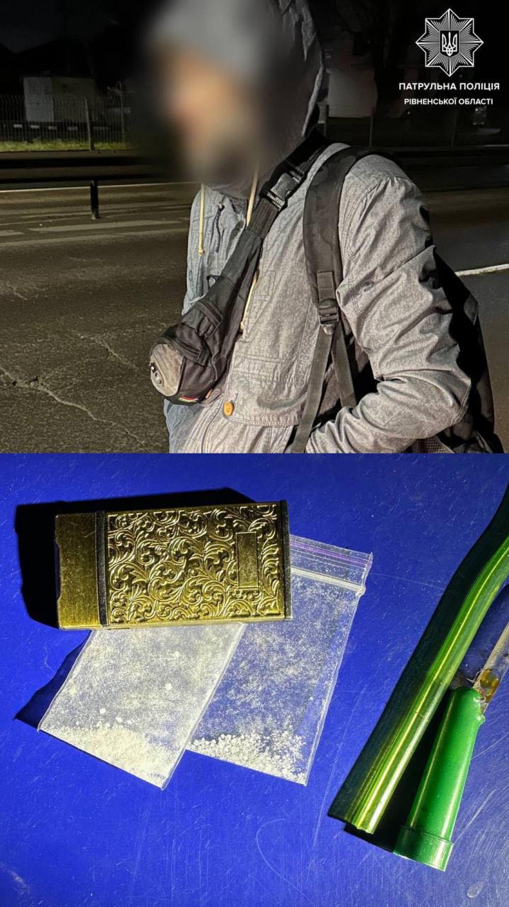 Під час поверхневої перевірки у нагрудній сумці 51-річного чоловіка патрульні виявили два поліетиленові зіп-пакети з кристалічною речовиною, схожою на наркотичну, а також пристрій для її вживання із нашаруванням бурого кольору.