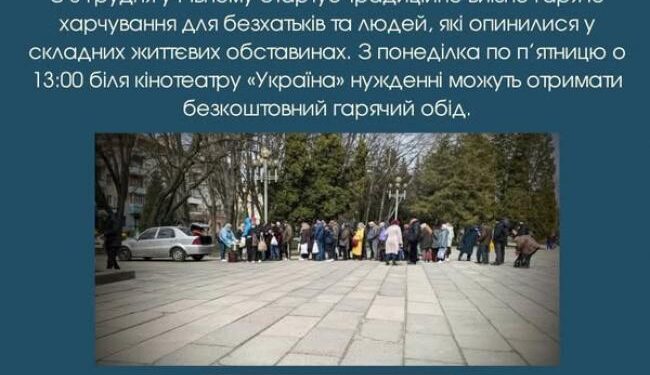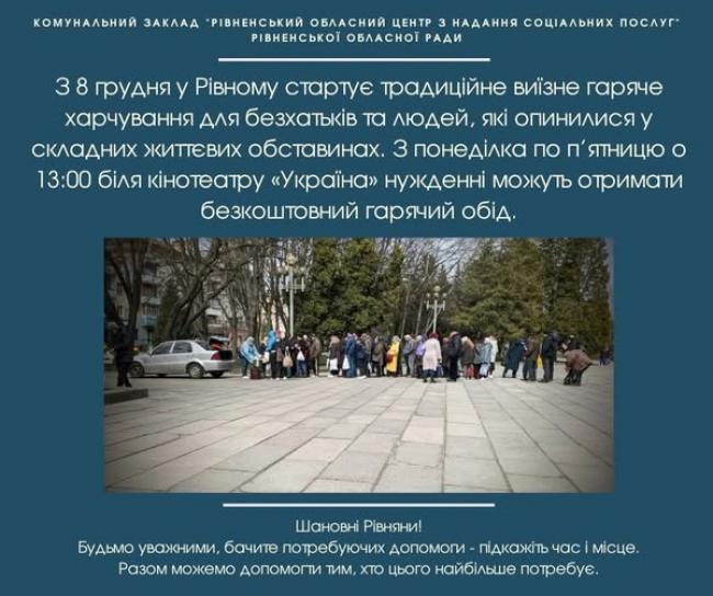 У понеділок, 8 грудня, у Рівному стартує традиційне виїзне гаряче харчування для безхатьків та людей, які опинилися у складних життєвих обставинах. Із понеділка по п’ятницю о 13:00 за кінопалацом «Україна» кожен, хто в скруті може отримати безкоштовний гарячий обід.