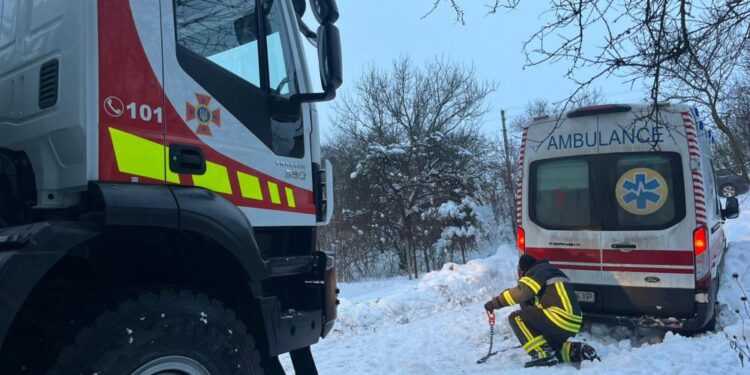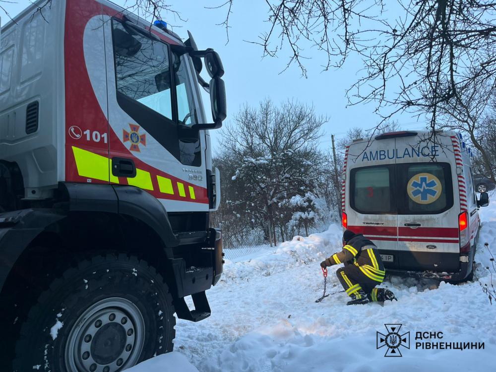 Вчора близько 16:00 у селі Городище Рівненського району по вулиці Садовій рятувальники надали допомогу з буксирування карети швидкої медичної допомоги, яка застрягла у сніговому заметі.