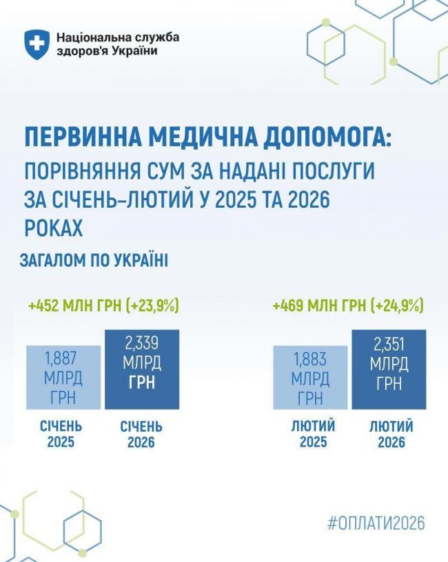 У січні 2026 року майже на пів мільярда гривень зросли суми, що підлягають оплаті закладам ПМД порівняно з січнем минулого року. Аналогічне зростання зафіксовано і в лютому.