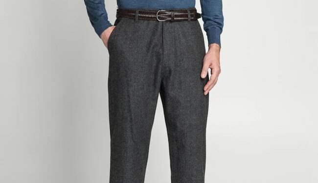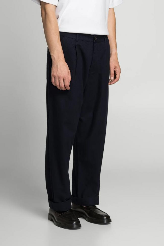 Вільний крій, глибокі складки й темний відтінок надають образу структури. Балансу між класикою та спортивним стилем можна досягти поєднанням футболки з кросівками.