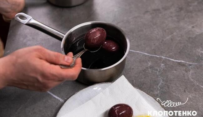 Крок 3. Ложкою дістаньте крашанки з вина через 6-8 годин, покладіть на тарілку з паперовим рушником і дайте обсохнути впродовж години.