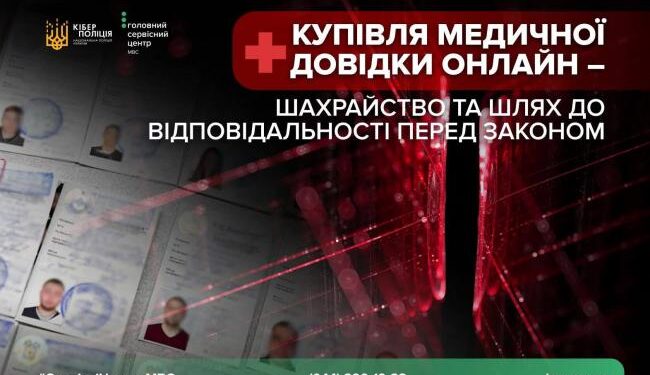 Головний сервісний центр МВС спільно з Департаментом кіберполіції Національної поліції України застерігають громадян: на просторах інтернету знову активізувалися шахраї, які пропонують «купити» медичну довідку щодо придатності до керування транспортними засобами без проходження реального медичного огляду.