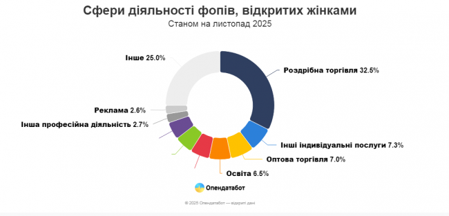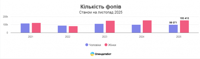 Загалом за 10 місяців 2025 року в Україні жінки заресєтрували 153 413 нових фопів — це 61% від усіх нових реєстрацій. До порівняння, ще у 2021 році частка жінок складала 51%.