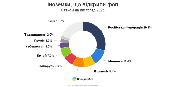 Варто зазначити, що іноземки також активно реєструють фопи в Україні. Найбільше фопів зареєстрували громадянки Росії (175), Молдови (68), Вірменії (50) і Азербайджану (49).