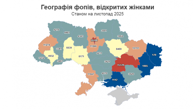 Кожен восьмий жіночий бізнес був відкритий у столиці — 20 286 фопів. Наслідують Дніпропетровщина з 15 129 реєстраціями, Київщина (11 846), Одещина (11 647) та Львівщина (11 274). Але найвищу частку жінок серед нових підприємців мають Сумщина, Полтавщина та Одещина: по 63%. У жодному регіоні чоловіки так і не змогли випередити жінок за кількістю нових бізнесів.